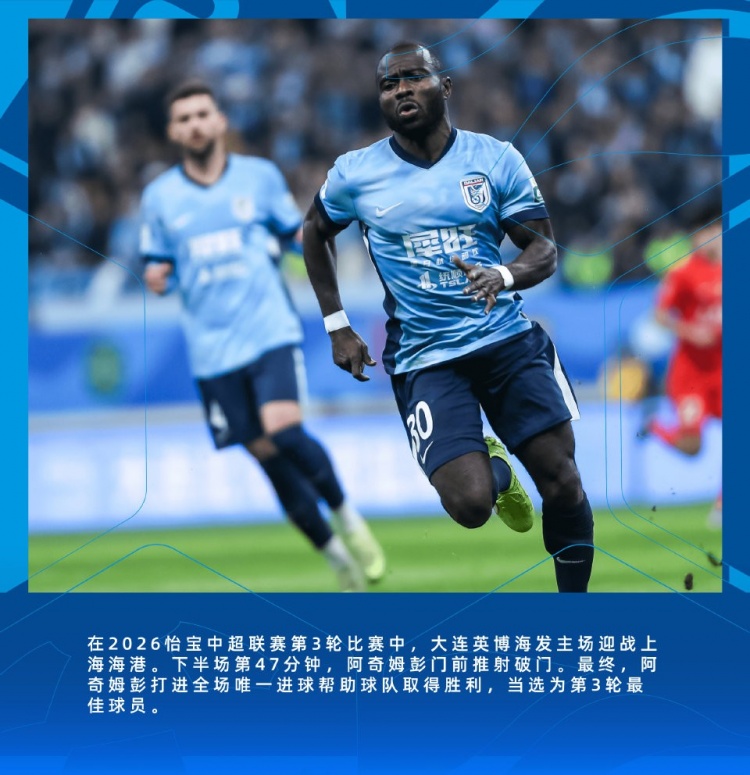 中超第3輪,大連英博主場1-0擊敗衛(wèi)冕冠軍上海海港,比賽第47分鐘阿奇姆彭門前推射破門,憑借這個進球他幫助球隊取得勝利,當選為第3輪最佳球員。