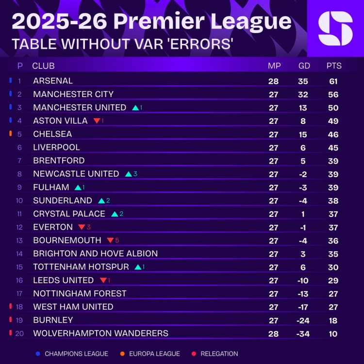 VAR沒(méi)有錯(cuò)誤情況下英超積分榜:
