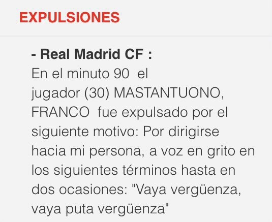 據(jù)《馬卡報(bào)》報(bào)道,主裁在裁判報(bào)告中記錄,馬斯坦托諾對(duì)他說:“真丟人,真xx的丟人(vaya vergüenza, vaya puta vergüenza)”