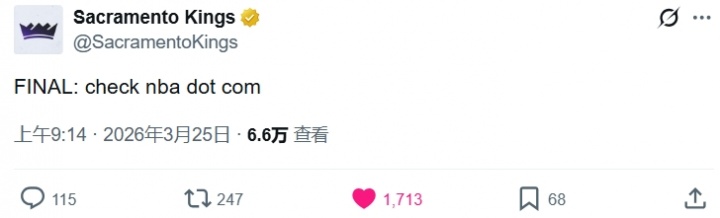 賽后,國王官推也是擺爛了,他們連本場比賽的比分和海報(bào)都懶得發(fā),直接一段文字應(yīng)付了事:“今天的最終比分你們?nèi)ba點(diǎn)康姆查吧”