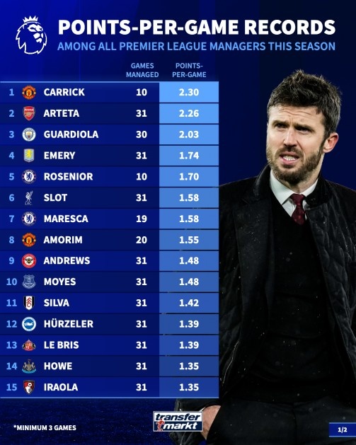 直播吧3月25日訊 德國(guó)轉(zhuǎn)會(huì)市場(chǎng)統(tǒng)計(jì)了本賽季英超主帥的場(chǎng)均積分(至少執(zhí)教3場(chǎng)),并列出榜單,卡里克2.3分居首,阿爾特塔2.26分次席。