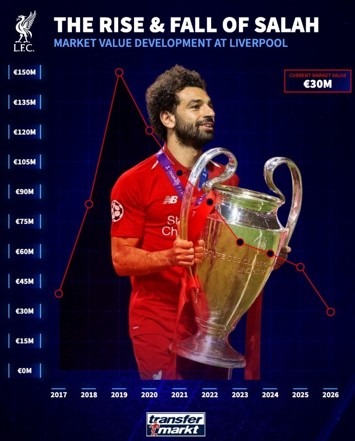 薩拉赫在2017年加盟利物浦時身價4000萬歐,之后憑借出色發(fā)揮身價一路上漲,在2019年達到巔峰的1.5億歐,之后隨著年齡增大身價開始走下坡路,本賽季發(fā)揮大幅下滑的情況下身價目前已經跌至3000萬歐。