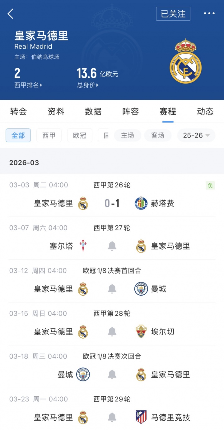 皇馬3月首戰(zhàn)失利,接下來本月皇馬將要面對塞爾塔、埃爾切,還要兩戰(zhàn)曼城,主場踢馬競。