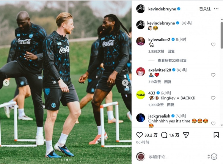 德布勞內(nèi)肌肉受傷接受手術(shù),自去年10月25日以來一直缺席?,F(xiàn)在德布勞內(nèi)已經(jīng)恢復(fù)訓(xùn)練,他在社交媒體上曬出訓(xùn)練照片,并配上笑臉的表情符號。
