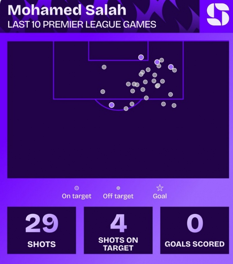 直播吧3月3日訊 Squawka統(tǒng)計(jì)了薩拉赫近10場(chǎng)英超比賽的數(shù)據(jù),這位利物浦前鋒射門(mén)29次,進(jìn)球掛零。