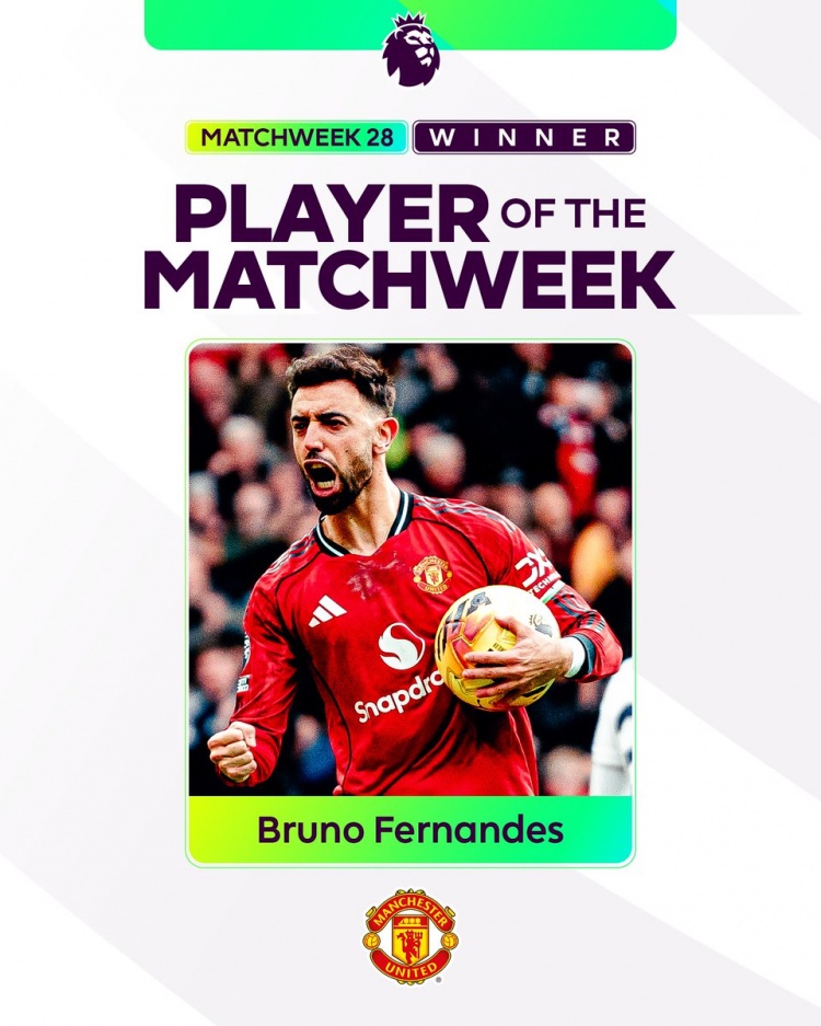 英超官方宣布,經(jīng)過球迷的投票,B費當(dāng)選本輪英超最佳球員,本賽季第四次獲得這一獎項。