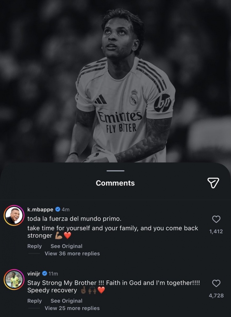直播吧3月4日訊 皇馬官方確認(rèn),隊(duì)內(nèi)前鋒羅德里戈右膝十字韌帶斷裂,外側(cè)半月板斷裂,隊(duì)友姆巴佩、維尼修斯社媒留言鼓勵(lì)羅德里戈。