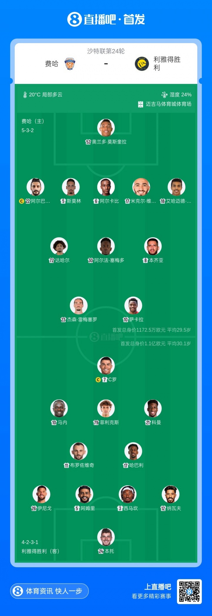 利雅得勝利首發(fā):24-本托、12-納瓦夫、3-西馬坎、5-阿姆里、26-伊尼戈·馬丁內(nèi)斯、11-布羅佐維奇、17-哈巴利、21-科曼、10-馬內(nèi)、79-菲利克斯、7-C羅