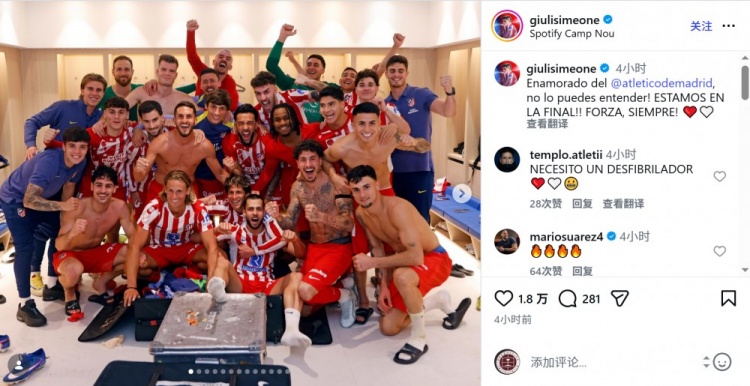 馬競(jìng)前鋒朱利亞諾·西蒙尼社媒曬出與隊(duì)友們?cè)诟率覂?nèi)的大合照,配文:“愛(ài)上馬競(jìng),這種情感你無(wú)法理解!我們晉級(jí)決賽了!加油,永遠(yuǎn)!”