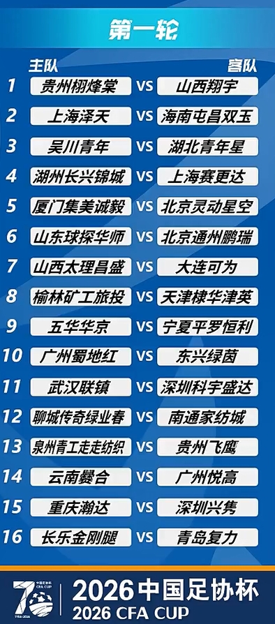 2026中國足協(xié)杯首輪比賽對陣如下:
