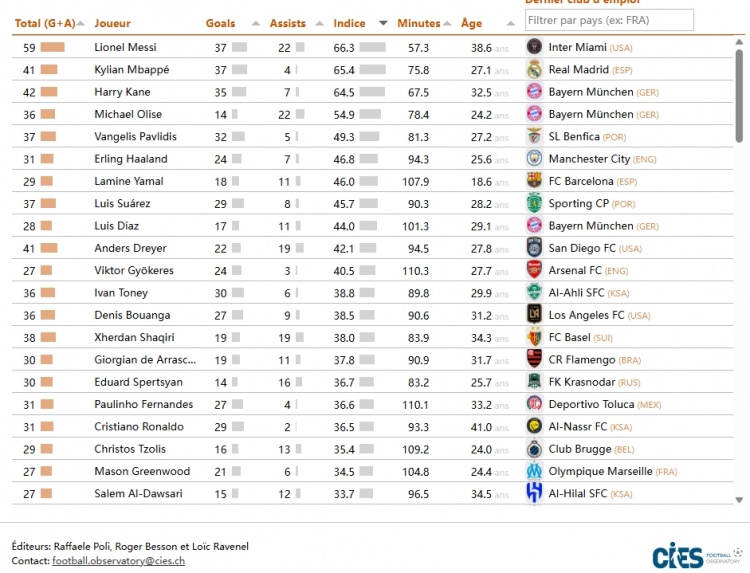 直播吧03月04日訊 瑞士足球媒體CIES足球天文臺(tái)發(fā)布最新數(shù)據(jù),統(tǒng)計(jì)了過去一年全球67個(gè)聯(lián)賽中參與進(jìn)球最多的球員。根據(jù)球員的貢獻(xiàn)值與所在比賽的平均競技系數(shù)進(jìn)行加權(quán)計(jì)算后,梅西以59次參與進(jìn)球(37球22助攻)66.3分的得分位列第一,姆巴佩以41次參與進(jìn)球(37球4助攻)65.4的得分緊隨其后,凱恩以42次參與進(jìn)球(35球7助攻)64.5的得分位列第三。