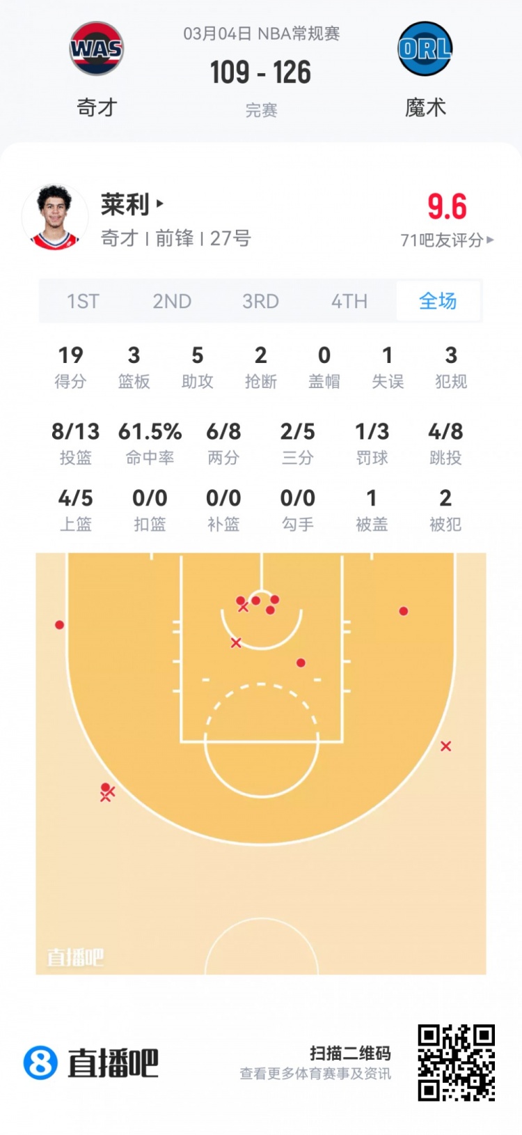 奇才落選秀朱利安·里斯 登場(chǎng)32.6分鐘
