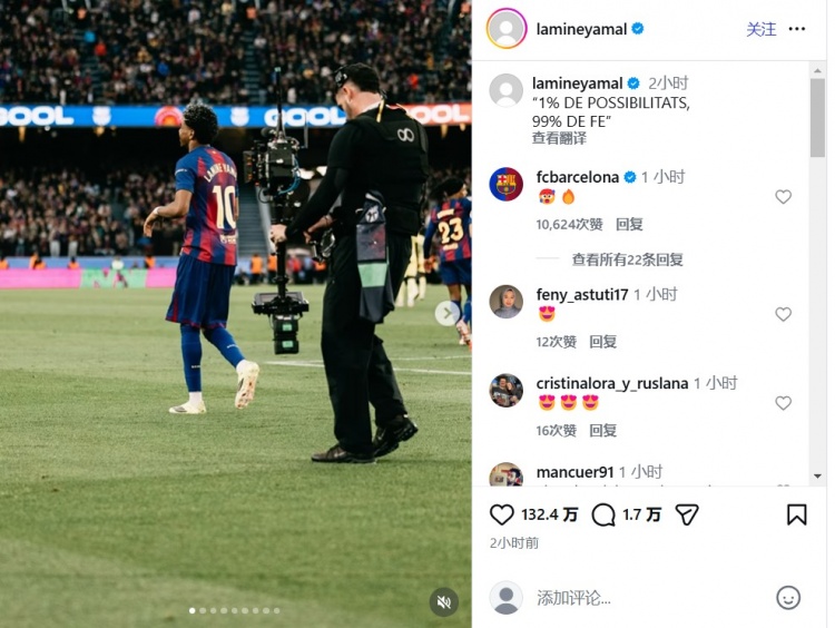 上演帽子戲法靜待馬競,亞馬爾社媒:1%的可能性,99%的信念