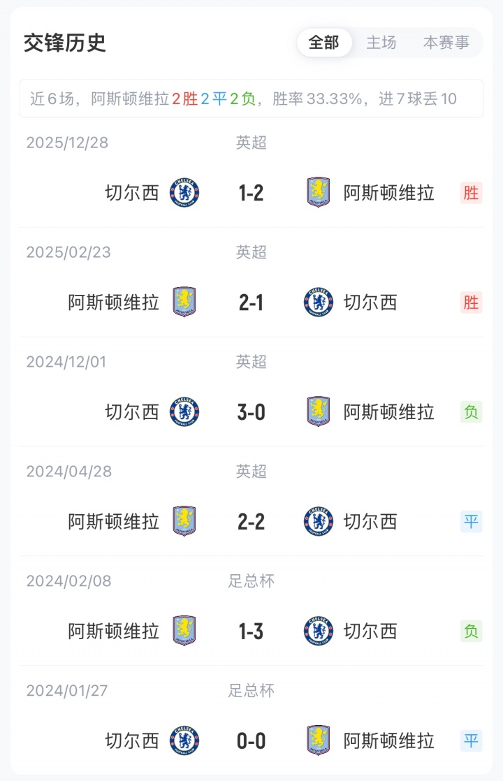 切爾西聯(lián)賽12勝9平7負(fù)積45分暫居英超第6,目前已遭遇三輪不勝;維拉聯(lián)賽15勝6平7負(fù)積51分位列英超第4,各項(xiàng)賽事近6場(chǎng)僅1勝。切爾西對(duì)陣維拉已經(jīng)兩連敗。