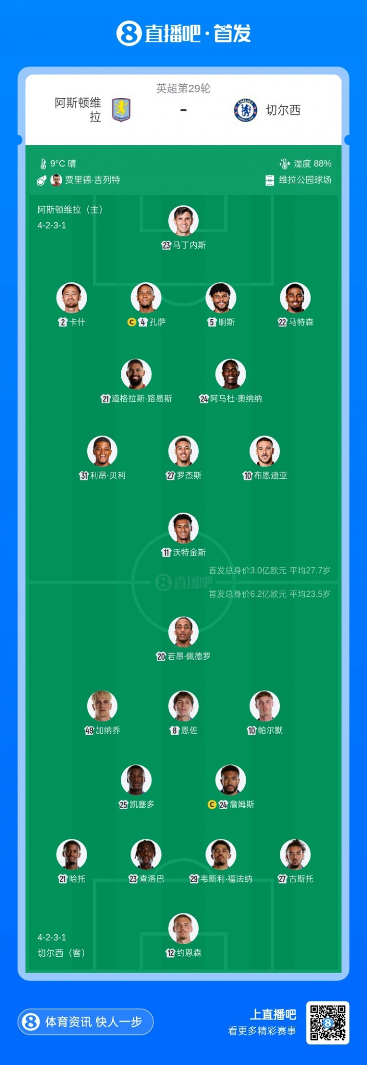 阿斯頓維拉首發(fā):23-馬丁內(nèi)斯、2-卡什、4-孔薩、5-明斯、22-馬特森、24-阿馬杜·奧納納、21-道格拉斯·路易斯、31-利昂·貝利、10-布恩迪亞、27-羅杰斯、11-沃特金斯