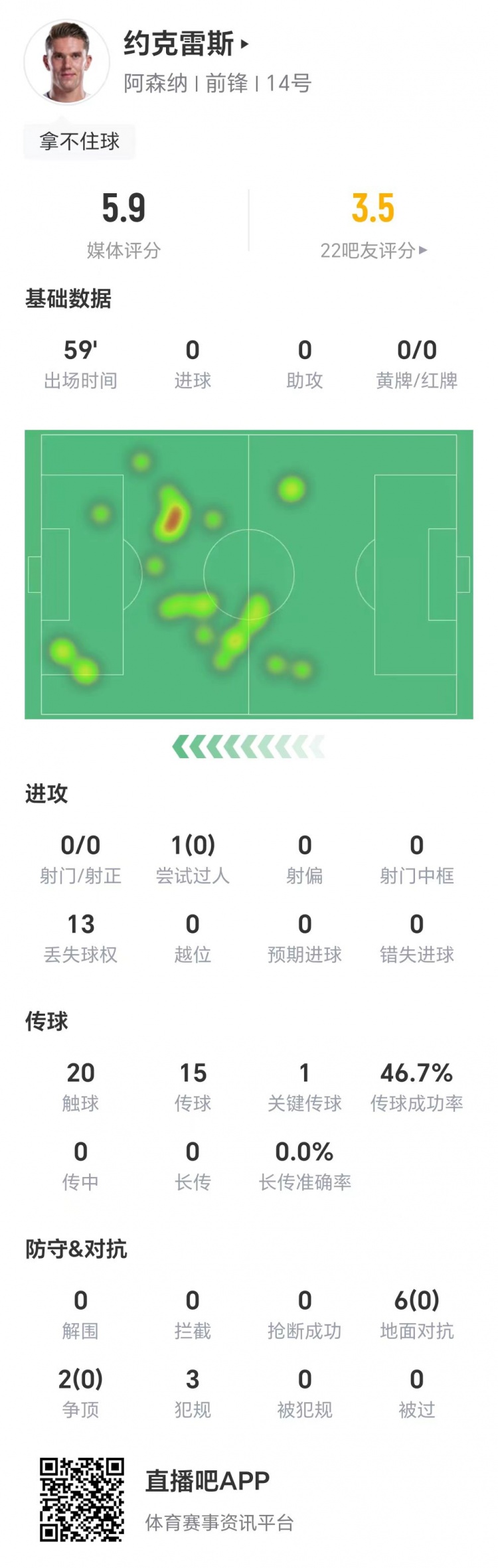 技術(shù)統(tǒng)計(jì)數(shù)據(jù)顯示,約克雷斯本場(chǎng)比賽零射門(mén),1次過(guò)人未能成功,1次關(guān)鍵傳球。另外,他6次地面對(duì)抗零成功,兩次爭(zhēng)頂也未能成功,獲評(píng)5.9分。