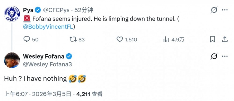 此役韋斯利·福法納為切爾西首發(fā)出戰(zhàn),有媒體稱(chēng)這位切爾西后衛(wèi)看起來(lái)受傷了,走進(jìn)球員通道時(shí)一瘸一拐,但福法納社媒辟謠,他表示:“嗯?我沒(méi)事。”