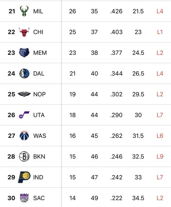 根據(jù)火箭媒體人Bradeaux統(tǒng)計(jì),目前聯(lián)盟最差的10支球隊(duì)加起來已經(jīng)44連敗了。