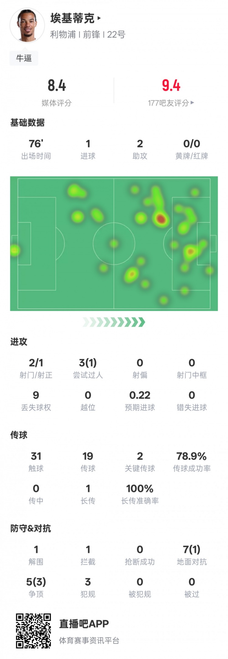 埃基蒂克本場數(shù)據(jù):1射2傳+2關(guān)鍵傳球1過人成功,評分8.4