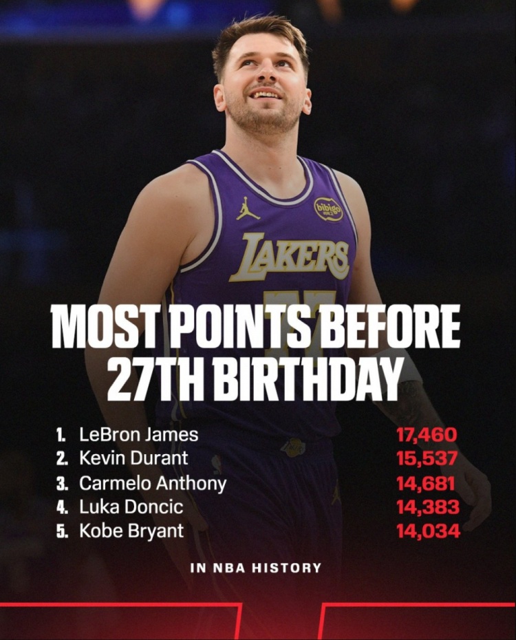 據(jù)統(tǒng)計(jì),東契奇在27歲合計(jì)得到14383分,同期歷史第四高,僅次于詹姆斯、杜蘭特和卡梅隆·安東尼。