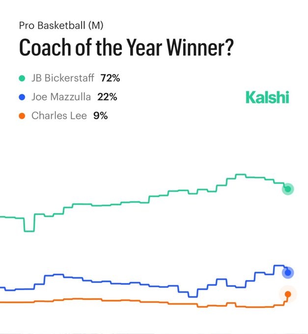 直播吧3月5日訊 預(yù)測(cè)平臺(tái)Kalshi Hoops更新了本賽季聯(lián)盟年度最佳主帥獎(jiǎng)項(xiàng)獲獎(jiǎng)概率,具體如下: