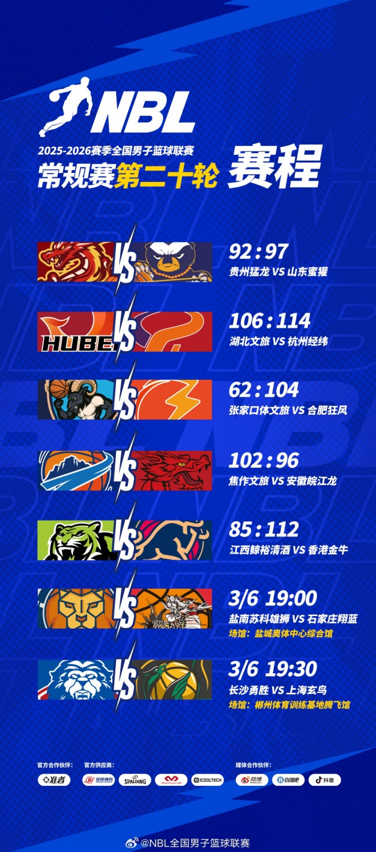 NBL常規(guī)賽第二十輪第二個比賽日,主場作戰(zhàn)的湖北文旅卡位戰(zhàn)不敵杭州經(jīng)緯;焦作文旅在加時賽表現(xiàn)出色,贏得與安徽皖江龍的卡位戰(zhàn)。張家口體文旅和江西鯨裕清酒均在主場不敵對手。