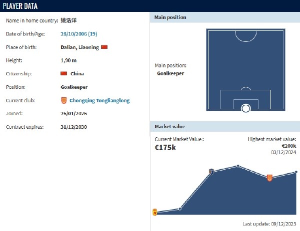 出生于2006年10月的門將姚浩洋,身高達到1米95,上賽季租借重慶銅梁龍期間有著出色的發(fā)揮,也是球隊沖超的功臣。要知道早在2024年,18歲的姚浩洋就已經(jīng)在外租時當選中甲最佳門將。所以為了他花費700萬元人民幣,也是重慶銅梁龍求賢若渴。