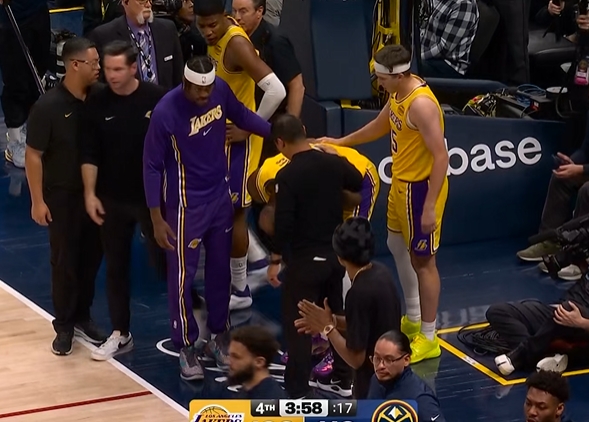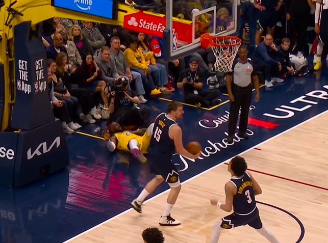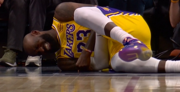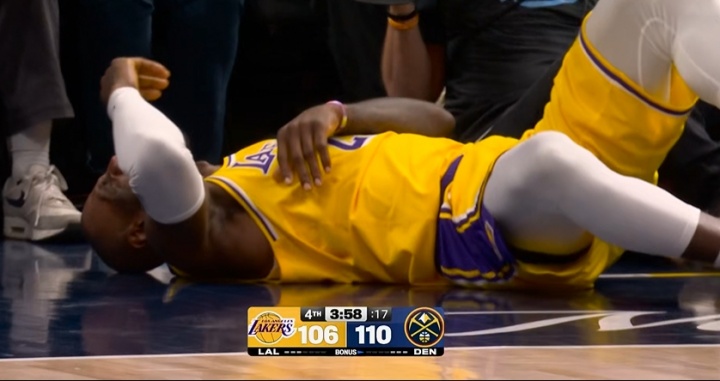 詹姆斯上籃后倒地不慎左胳膊肘頂?shù)綌z影師腳 倒地掙扎表情痛苦