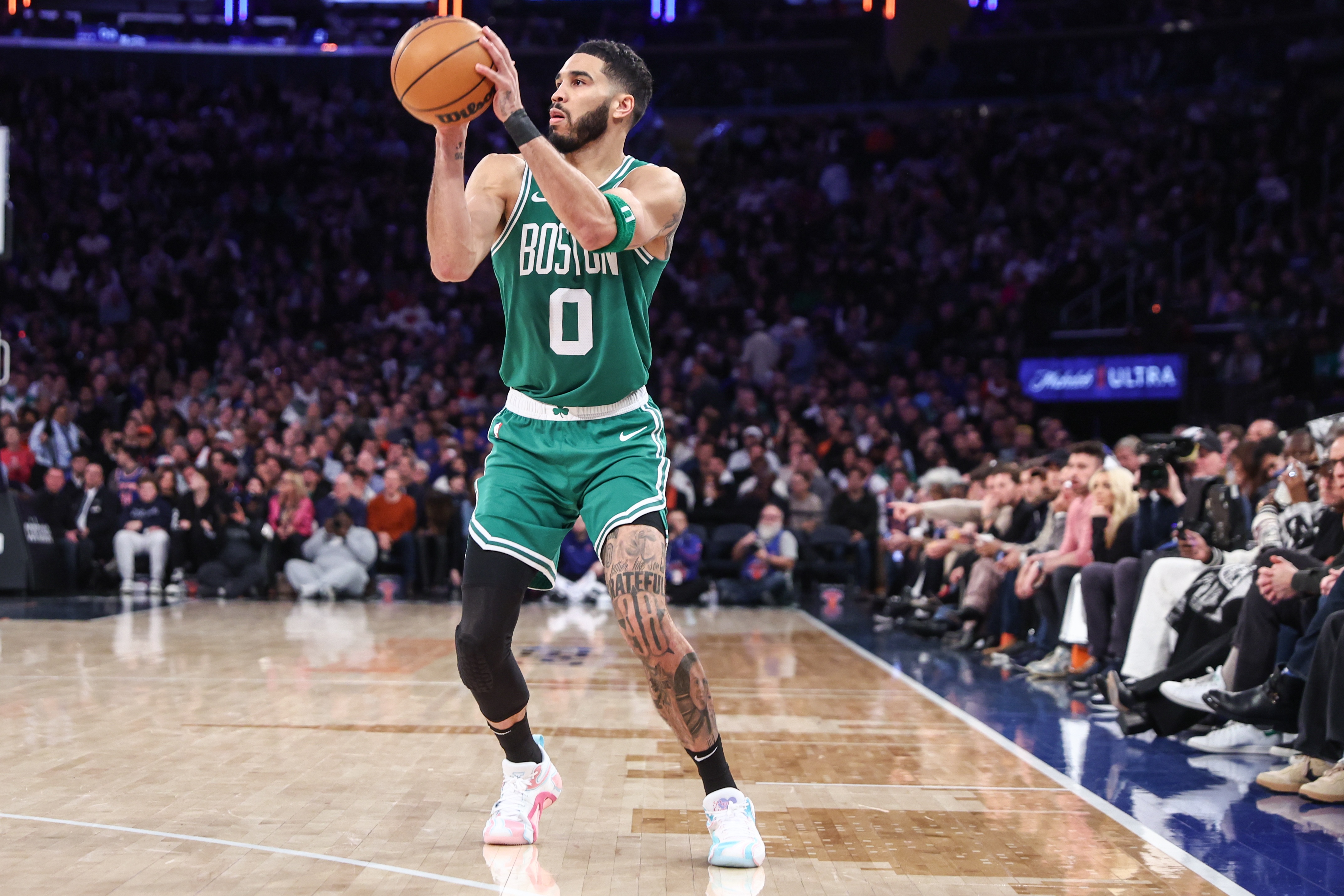 塔圖姆將在幾個(gè)方面提升凱爾特人的戰(zhàn)力。他們的進(jìn)攻目前領(lǐng)跑全聯(lián)盟,但仍有提升空間。根據(jù)Cleaning the Glass的數(shù)據(jù),他們的有效投籃命中率排名第11,區(qū)域有效投籃命中率排名第29。單憑塔圖姆的存在就應(yīng)該能提升投籃質(zhì)量。如果他的身體狀況接近受傷前的水平,他可能會(huì)顯著優(yōu)化這項(xiàng)指標(biāo)。