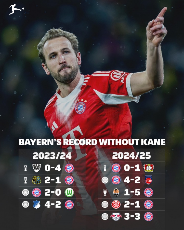 德甲官方統(tǒng)計(jì)了過(guò)去兩個(gè)賽季凱恩缺席情況下拜仁的戰(zhàn)績(jī),2023-2024賽季2勝2負(fù),2024-2025賽季2勝1平2負(fù)。