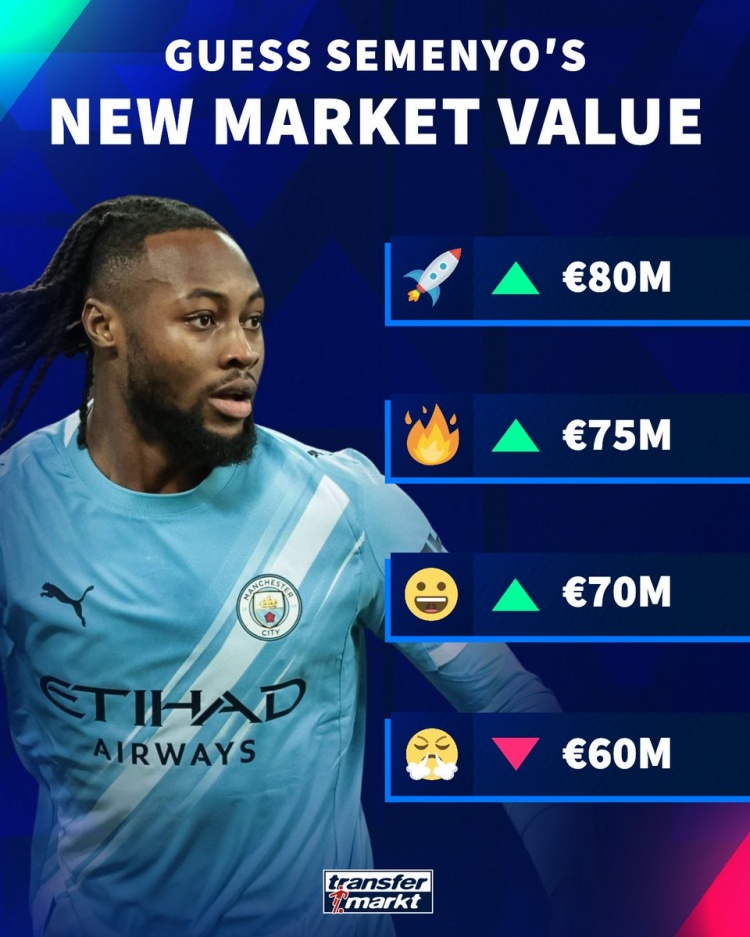 直播吧3月6日訊 德國轉(zhuǎn)會市場預熱曼城前鋒塞梅尼奧的最新身價,他的身價最高可能達到8000萬歐,最低6000萬歐。