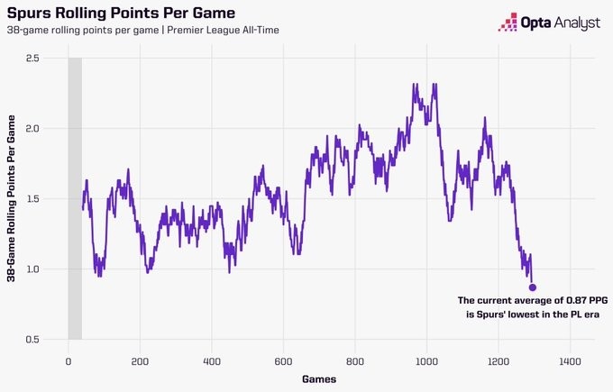熱刺在過去的38場英超比賽中僅積33分。場均0.87分的得分率是該俱樂部整個聯(lián)賽歷史上在連續(xù)38場比賽跨度內(nèi)的最低紀(jì)錄(按勝場積3分計算),追平了其在1912年和1915年創(chuàng)下的戰(zhàn)績。