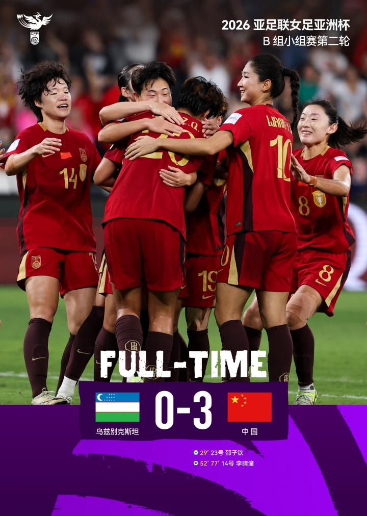 兩連勝!2026亞足聯(lián)女足亞洲杯B組小組賽第二輪,中國隊3比0戰(zhàn)勝烏茲別克斯坦隊。邵子欽點球破門,李晴潼梅開二度。