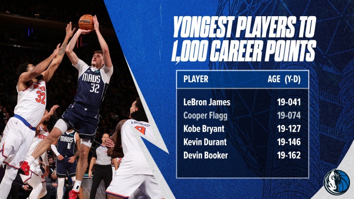 據(jù)統(tǒng)計,弗拉格(19歲74天)是歷史第二年輕拿到1000分的球員,僅次于詹姆斯(19歲41天)。