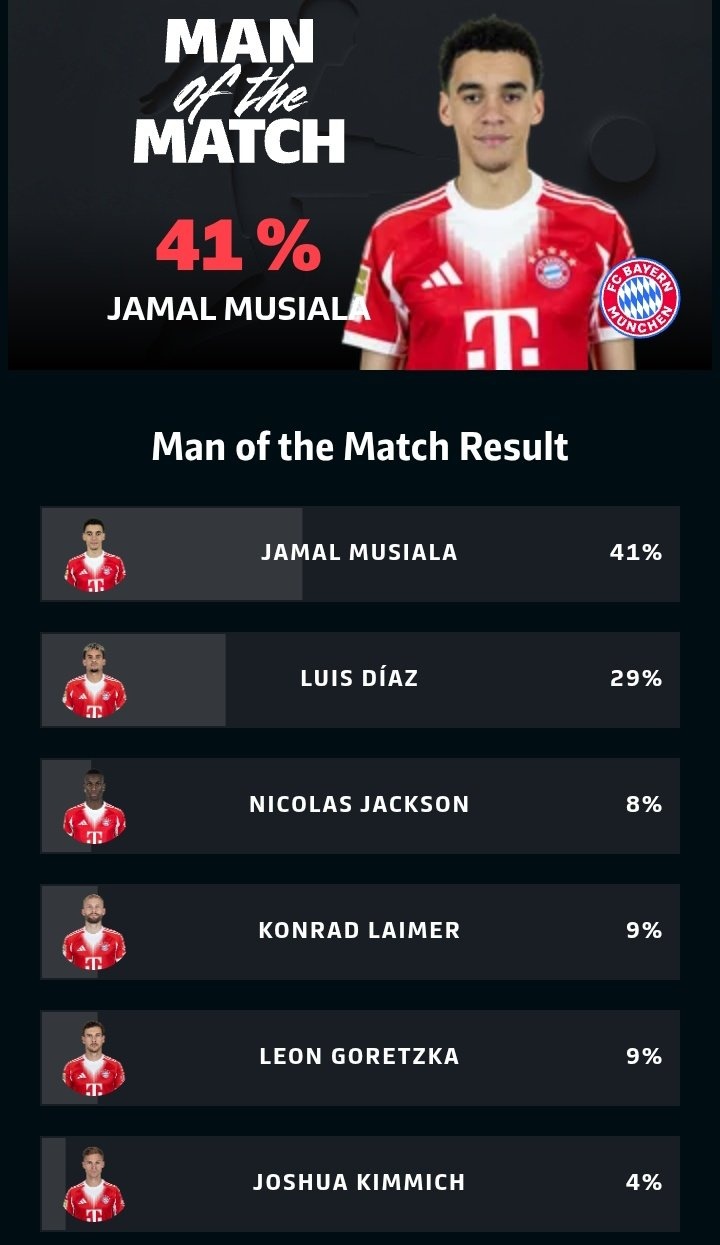 直播吧3月7日訊 德甲第25輪,拜仁4-1戰(zhàn)勝門興。穆西亞拉首發(fā)出戰(zhàn),賽后以41%得票率當(dāng)選為全場最佳球員。