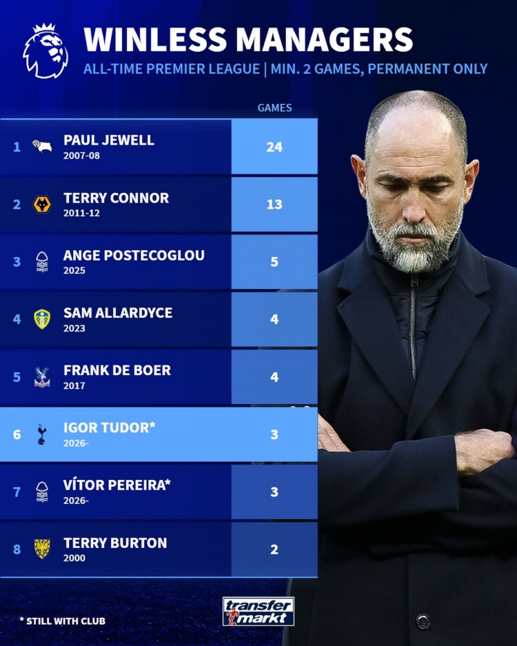 6、圖多爾,2026年至今,熱刺,3場(chǎng)不勝