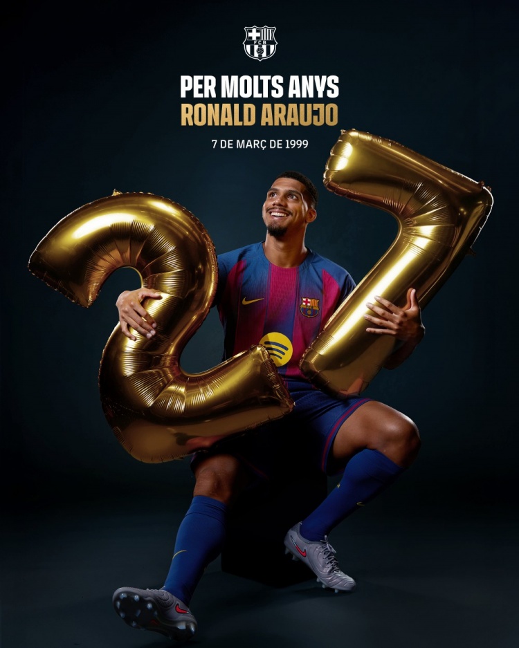 直播吧3月7日訊 今日是巴薩后衛(wèi)阿勞霍27歲生日,巴薩官方社媒曬照為其送上祝福。