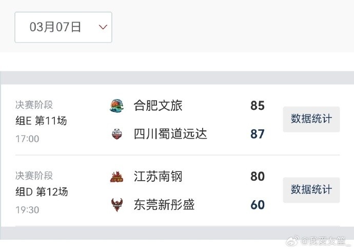 江蘇南鋼 80-60 東莞新彤盛,江蘇女籃四人得分上雙,孫宇15分7籃板,許晨妍14分,吳夢婕和趙可欣各得13分。廣東女籃僅馮果果一人得分上雙,拿到10分4籃板。