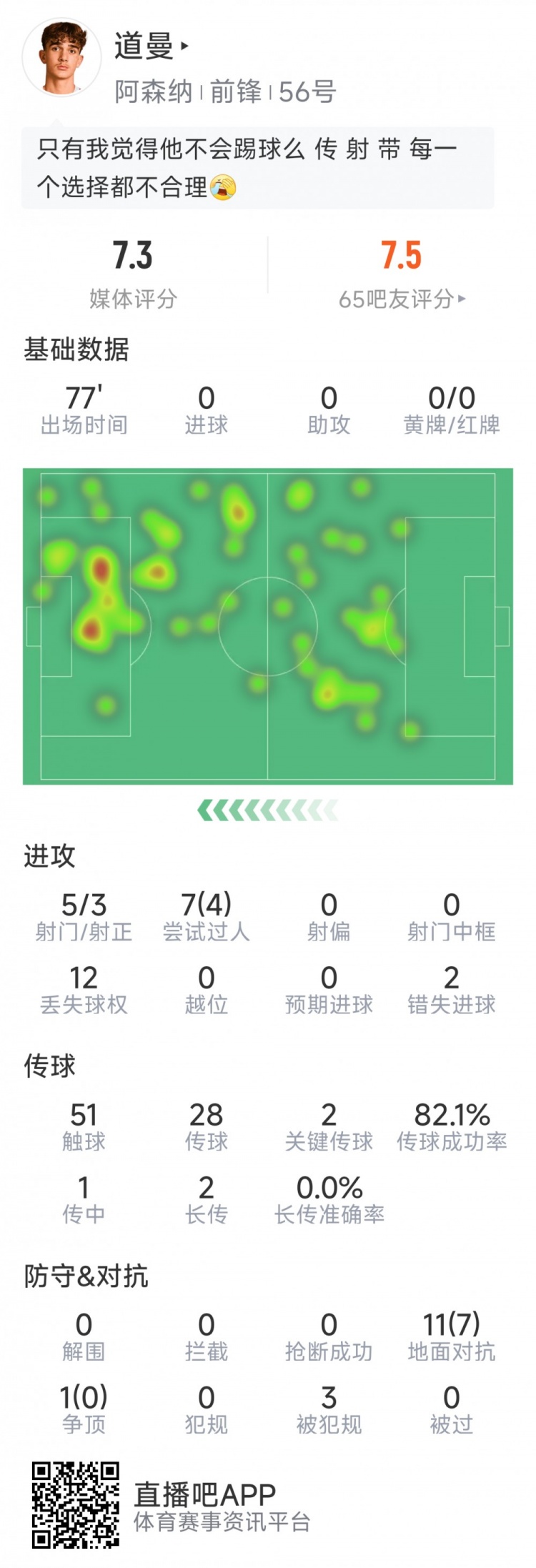 直播吧3月7日訊 在本輪足總杯阿森納對陣曼斯菲爾德的比賽中,16歲道曼首發(fā)出場,以下為他在本場數(shù)據(jù):