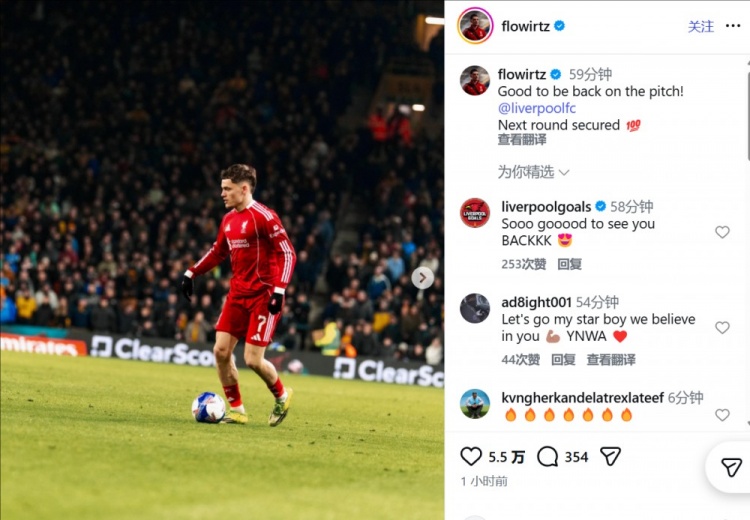 直播吧3月7日訊 利物浦在足總杯1/4決賽3-1擊敗狼隊晉級,賽后維爾茨更新了社媒。