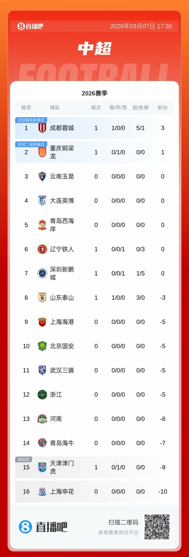 直播吧03月07日訊 今日中超首輪泰山戰(zhàn)勝遼寧鐵人,津門虎與銅梁龍打平。最新積分榜如圖,泰山取得新賽季開門紅,目前負3分,津門虎負9分排在倒數(shù)第二。