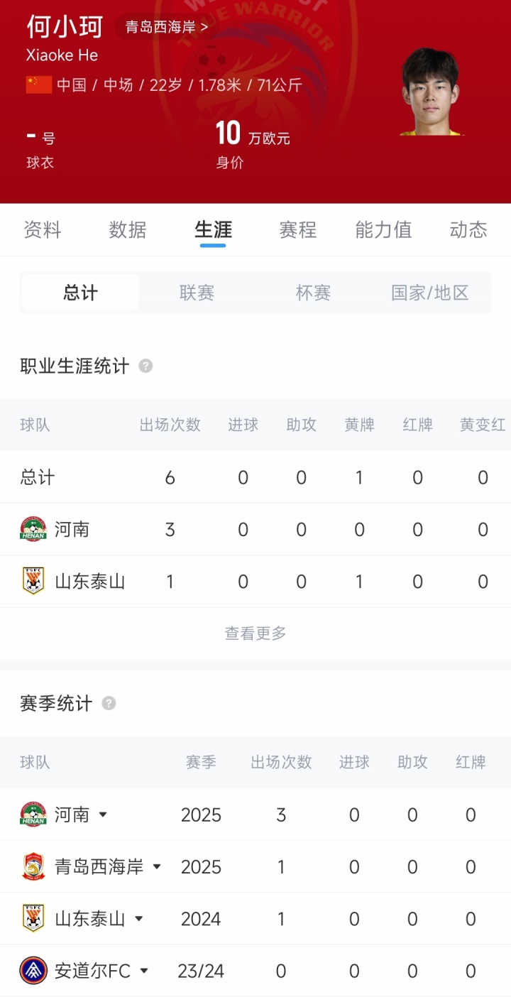 2024年夏季,何小珂回到母隊山東泰山,半個賽季僅留下2次出場的數(shù)據(jù)。2025年,何小珂先是加盟青島西海岸,半個賽季后又被租借到河南隊。這一年他為西海岸出戰(zhàn)1場足協(xié)杯、為河南隊出戰(zhàn)3場中超聯(lián)賽,4次出場的總時間也僅有82分鐘。