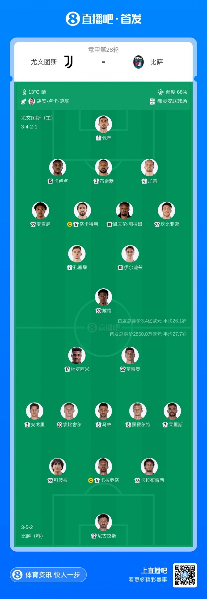 直播吧3月8日訊 意甲第28輪,尤文主場迎戰(zhàn)比薩比賽即將打響。賽前首發(fā)出爐。