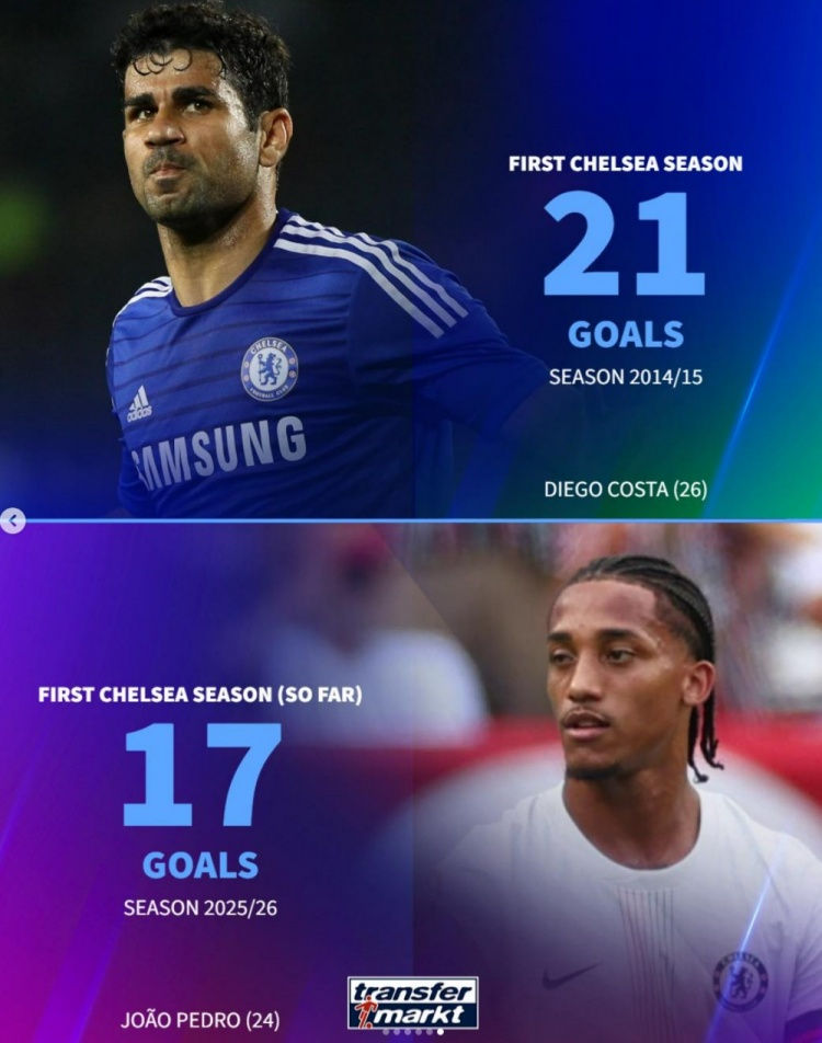 據(jù)統(tǒng)計(jì),若昂·佩德羅在切爾西的首個(gè)賽季各項(xiàng)賽事已經(jīng)打進(jìn)17球,德轉(zhuǎn)也對(duì)比了切爾西近幾個(gè)賽季鋒線(xiàn)新援首個(gè)賽季進(jìn)球數(shù)據(jù),其中迭戈·科斯塔在14/15賽季21球最多,法爾考在15/16賽季只有1球,莫拉塔在17/18賽季打進(jìn)15球,維爾納在20/21賽季打進(jìn)12球,盧卡庫(kù)在21/22賽季打進(jìn)15球,杰克遜在23/24賽季打進(jìn)17球。