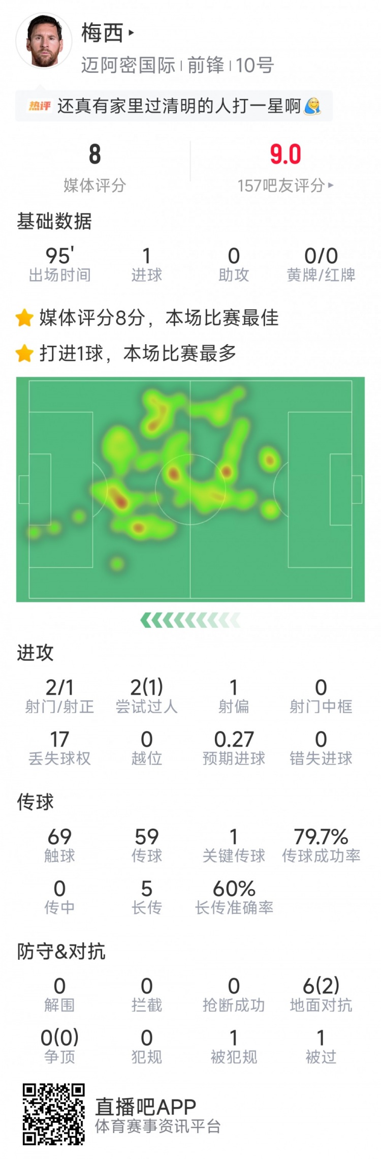 直播吧3月8日訊 在本輪美職聯(lián),邁阿密國(guó)際2-1擊敗華盛頓聯(lián),以下為梅西全場(chǎng)數(shù)據(jù):
