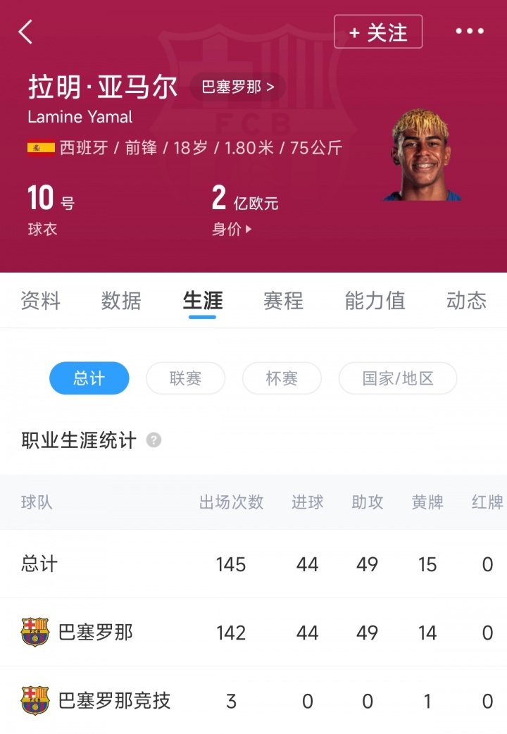 據(jù)德轉(zhuǎn)數(shù)據(jù)顯示,年僅18歲的亞馬爾至今各項賽事為巴薩一線隊出戰(zhàn)142場,貢獻44球49助,同時他在西班牙國家隊也有著23場6球12助的數(shù)據(jù)。也就是說,亞馬爾職業(yè)生涯165場已有50球61助,要知道,他現(xiàn)在僅僅18歲而已。