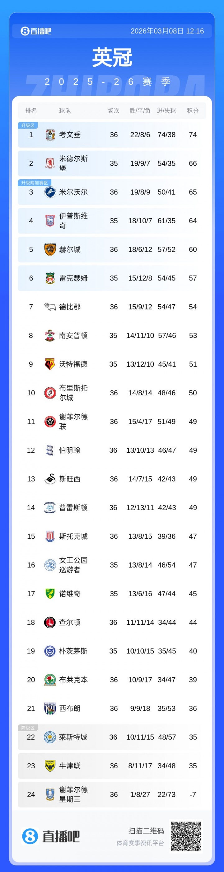 直播吧03月08日訊 英冠第36輪結(jié)束多場(chǎng)對(duì)決,其中考文垂2-0擊敗布里斯托爾城,萊斯特城1-1伊普斯維奇。