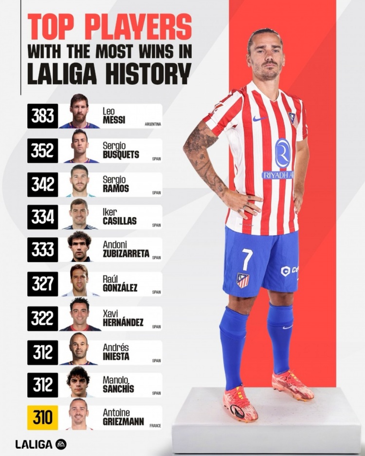 直播吧3月8日訊 西甲統(tǒng)計(jì)了球員在該聯(lián)賽的取勝場(chǎng)次,并列出西甲歷史勝場(chǎng)排名,梅西383勝居首,格列茲曼310勝躋身前十。