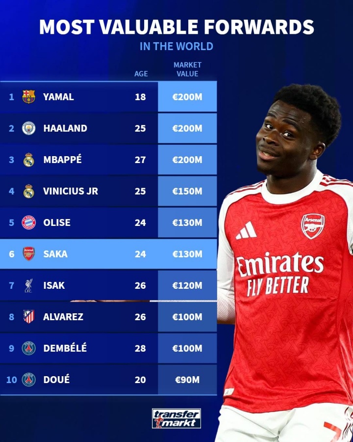 直播吧03月08日訊 明天,德轉(zhuǎn)將會(huì)更新英超球員身價(jià),德轉(zhuǎn)今天列出了現(xiàn)在的前鋒位置球員身價(jià)榜,亞馬爾、哈蘭德、姆巴佩2億歐居首。