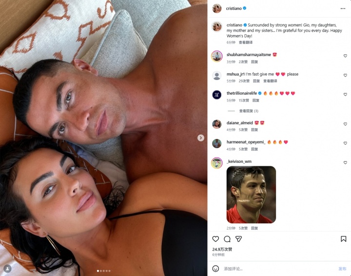 C羅配文寫道:“周圍都是女強(qiáng)人!喬治娜、我的女兒們、我的媽媽還有姐姐們……我每天都很感激你們,婦女節(jié)快樂!”